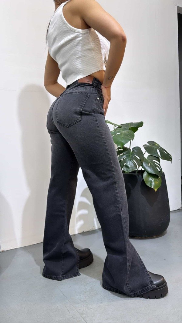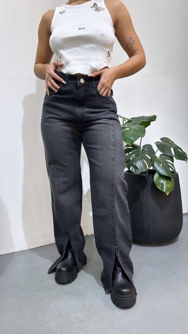 Jeans gris rígido PIETA. Tiro alto calze perfecto, con tajo adelante.
