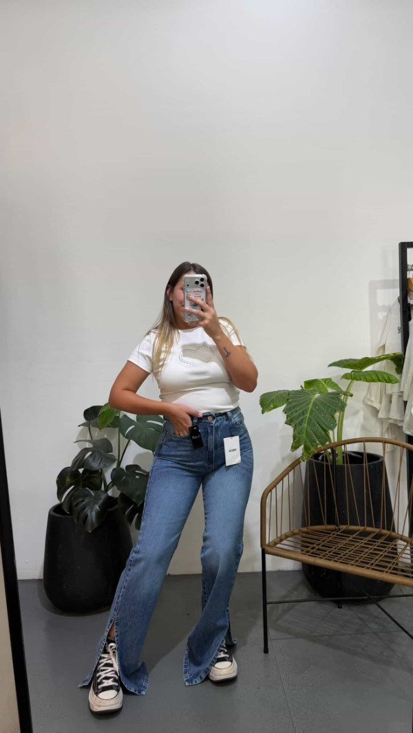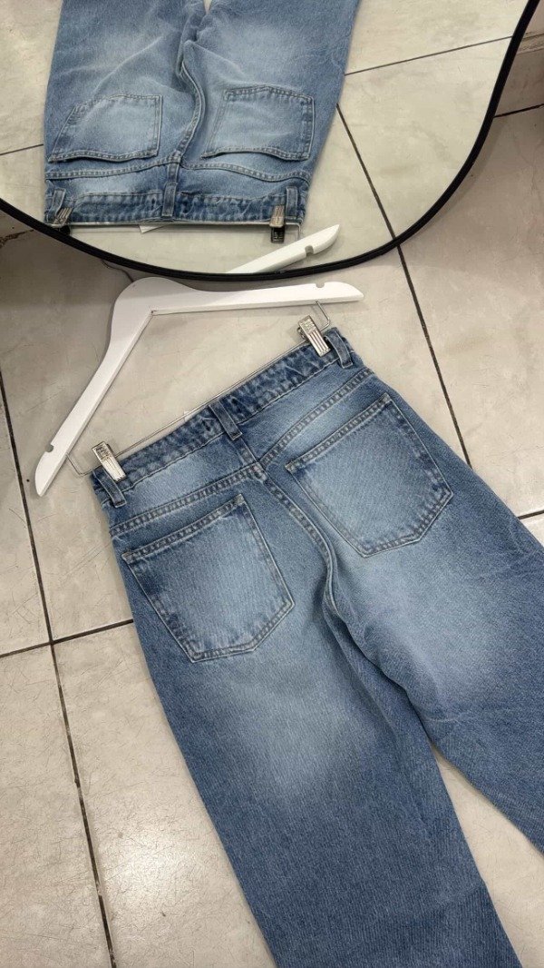 Jeans stright rigido. Tiro alto.