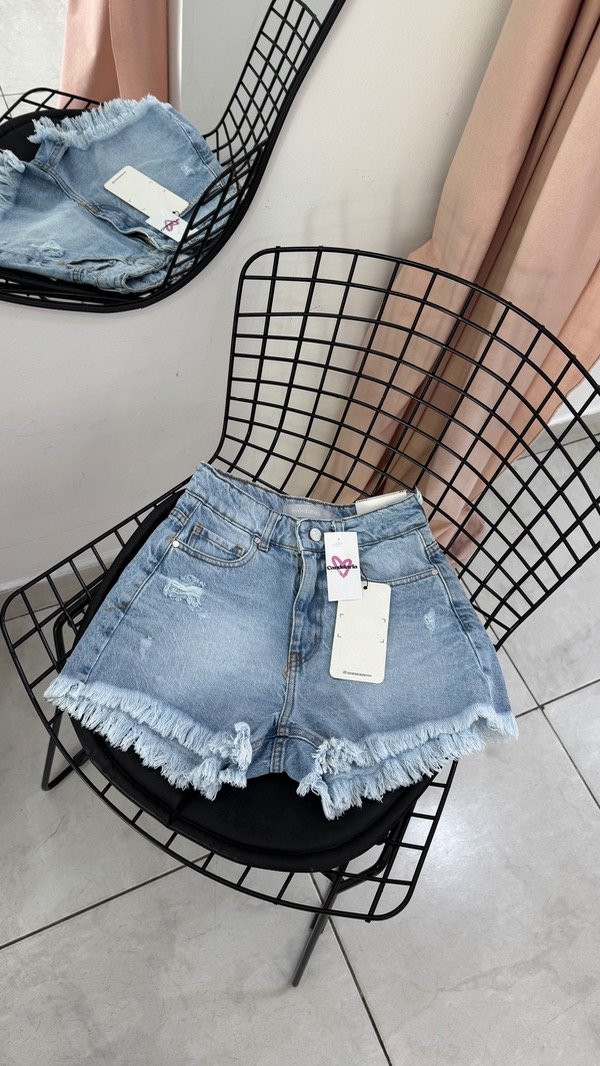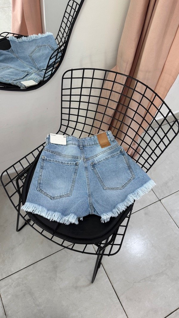 Short celeste desflecado con roturas. Rígido, tiro alto.