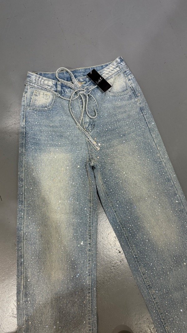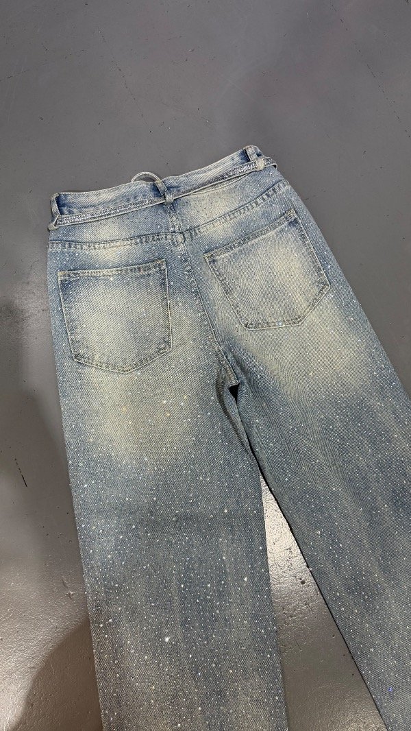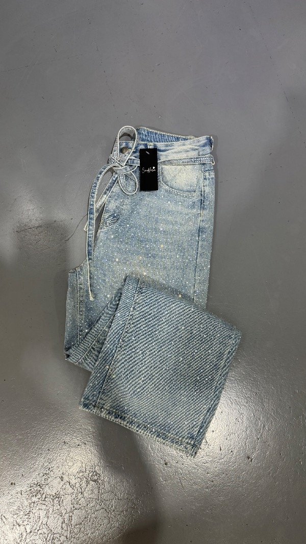 Jeans wide leg importado, full strass. Rígido, tiro alto.