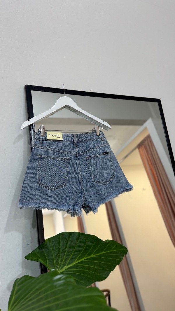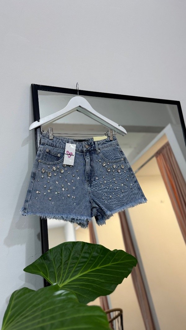 Short de jeans importado con strass. Rígido, tiro alto. Desflecado